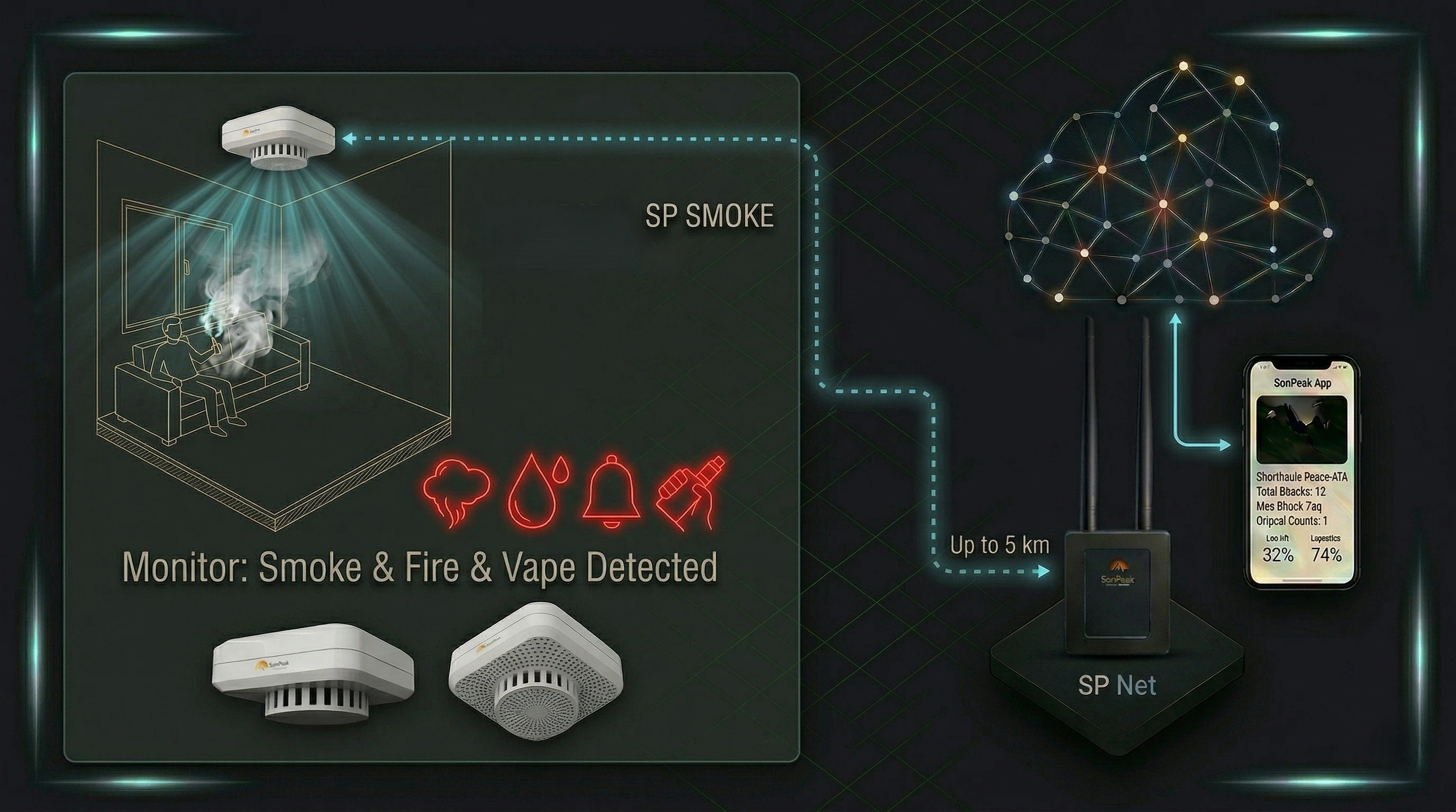 The core of the system is the SP Smoke intelligent detector. Unlike standard sensors, it utilizes a combination of a precision optical smoke sensor and built-in temperature and humidity sensors. This allows the device to analyze the environmental composition in real-time and unfailingly distinguish harmless water vapor or dust from an emerging high-temperature fire. Upon detecting a threat, the device activates a powerful 100 dB siren, ensuring the alarm is heard even in a noisy industrial workshop.