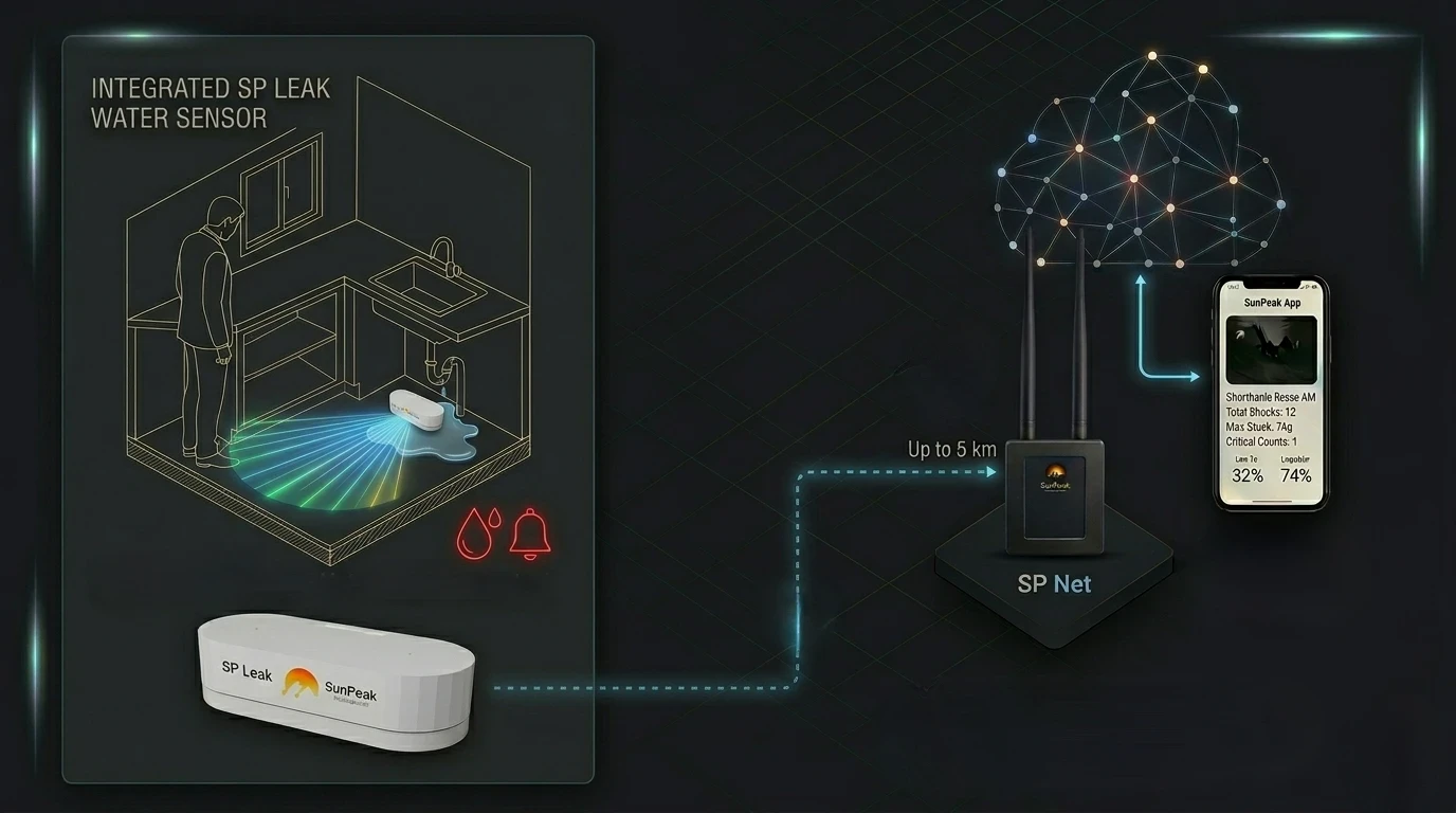 In the SunPeak SmartCloud ecosystem, detecting water is only the beginning. The moment the SP Leak sensor registers contact with liquid, the cloud transmits a command within fractions of a second to the SP Act wireless actuator, which physically shuts off the water supply via a solenoid or ball valve. This "closed-loop" safety system guarantees that flooding is stopped automatically, even if the incident occurs in the middle of the night or at a remote facility.